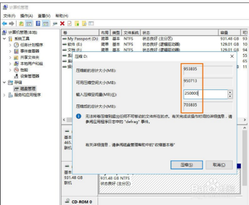 4、下一步,根据需要输入要分区的磁盘大小,点击【压缩】。请参考下图操作: