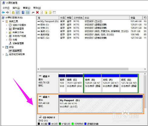 1、首先打开你的开始菜单,找到“我的电脑”,有的人没有,那就找到“计算机”。 2、接着我们在“计算机”上右键单击,在但得右键菜单中,选择“管理”。 3、这时候打开了计算机管理,在这里找到存储这个选项,双击打开。 4、打开了存储对话框,看到这里有一个磁盘管理(本地),双击打开它。 5、到此,你就看到我们要用到的磁盘管理器了。这里展示了你的电脑硬盘和移动硬盘,下面我们来设置一下分区。 6、先将移动硬盘备份,将其中的内容都复制到电脑里,然后我们右键单击该硬盘,然后选择(删除卷)。 7、你会看到一个警告提示你备份你的硬盘,点击“是”就可以。 8、接着你会看到,磁盘1中,未分配区域大小查不如何将移动硬盘分区