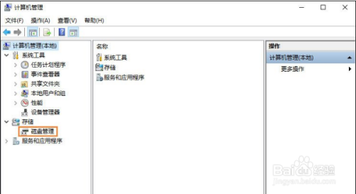 第二步,打开了计算机管理对话框,在左侧的菜单栏有个“存储”菜单打开下面的“磁盘管理”选项