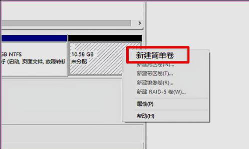 第八步,将光标移到这块区间上面,单击鼠标右键,就会弹出一个对话框,然后选择第一项就可以了“新建简单卷”