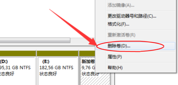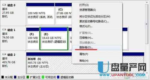 2、 然后找到移动硬盘所在的列表,这里为新加卷(I:),然后用鼠标右键单击这个区域,会弹出菜单,我们选择删除卷来删除这个分区。