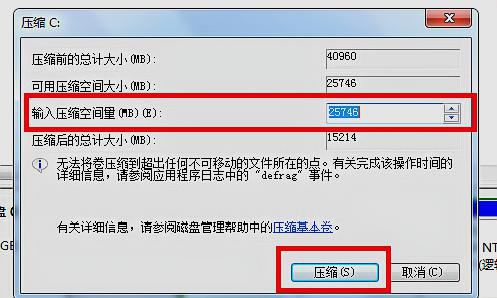 第六步,计算好要压缩的空间以后,确认无误点击“压缩”就可以了