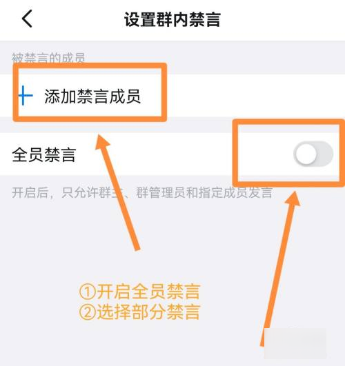 点击全员禁言后的按钮开启全员禁言或者点击添加禁言成员开启部分成员禁言。