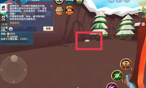 2、进来极寒之地后来到如下所示的位置,看到第一棵树如图中方框位置,然后向左转。