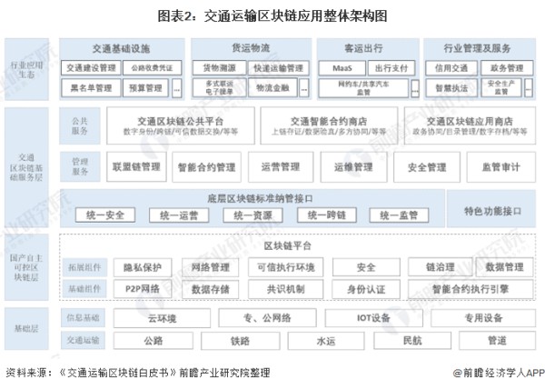 区块链技术与应用目前处于发展阶段,在学习、开发、使用、运维等方面门槛较高,区块链社区、区块链云服务等产业配套基础设施尚不完善,从业人员不足,不利于区块链技术在交通运输行业产业化应用。此外,从其他行业应用实践来看,机构各自建链会导致链与链之间的数据不能互通、业务难以协作,阻碍区块链发挥互信协作的价值。因此,推广区块链技术在交通运输领域应用必须首先要做好顶层设计。交通运输区块链的整体架构可分为四层,分别是基础层、国产自主可控区块链层、交通区块链基础服务层、行业应用生态层。