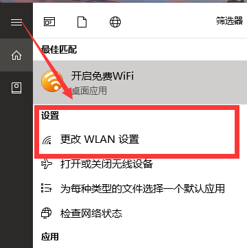 3、在输入框上面可以看到快速的搜索到“设置”里面的“更改WLAN设置”,点击进入。