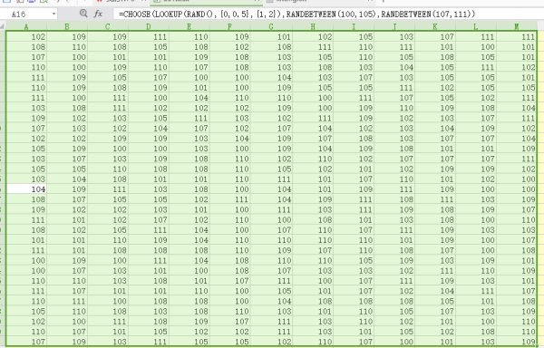 =CHOOSE(LOOKUP(RAND(),{0,0.5},{1,2}),RANDBETWEEN(100,105),RANDBETWEEN(107,111))