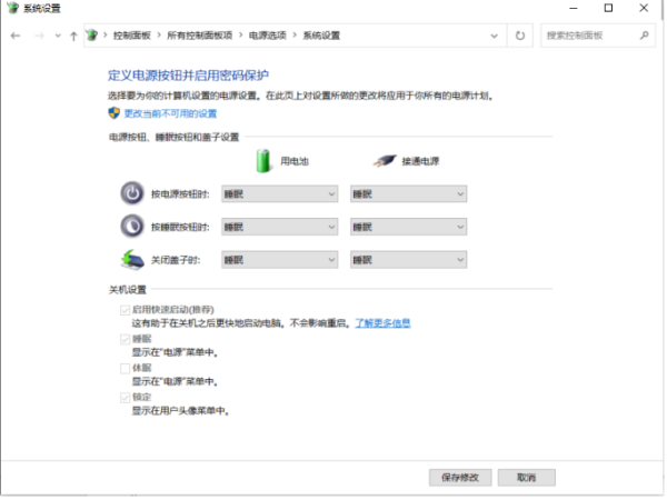 您可以设定在使用电池电源或是接通电源时,当按下电源按钮或是盖上屏幕时要进行的动作(不采取任何操作、睡眠、休眠、关机)。设定完成后再点选[保存修改]。