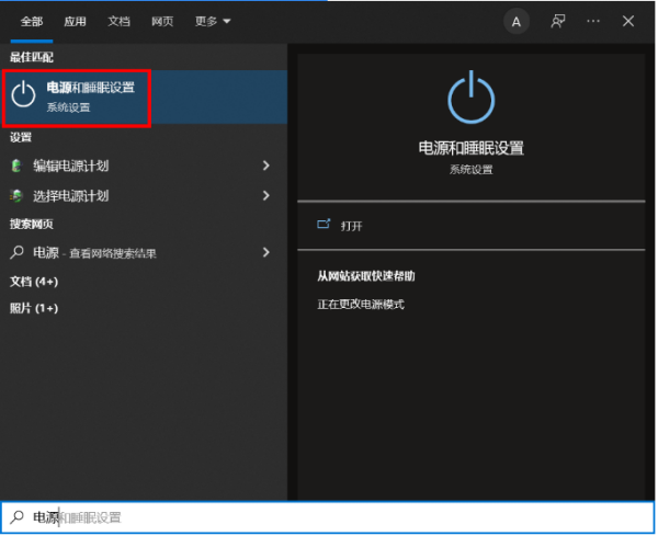 在Windows搜寻栏输入并点击打开[电源和睡眠设置]。