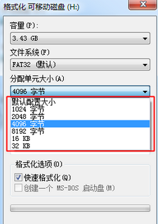 3、分配单元大小的设置,当你选择了文件系统格式后,分配单元大小会自动生成,正常情况下是不需要做修改的。