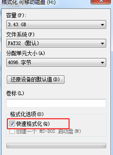 5、下面就是格式化选项了,这一项中有一个快速格式化选项。何为快速格式化呢,快速格式化只是删除所在驱动器的文件,而并不对磁盘扇区重写,可以用手段恢复文件,格式化时间很短。这是大家常用的格式化。