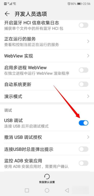 5、返回开发人员选项页面,可以看到USB调试模式已打开。