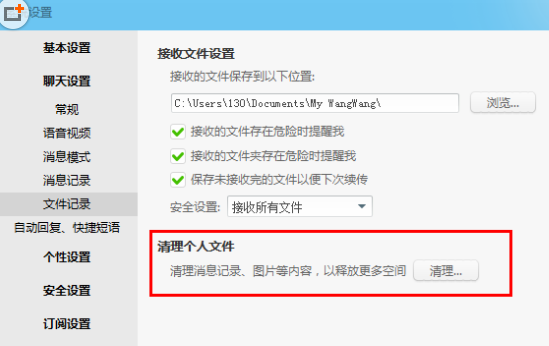 2.选择聊天设置—文件记录—清理个人文件,点击清理。