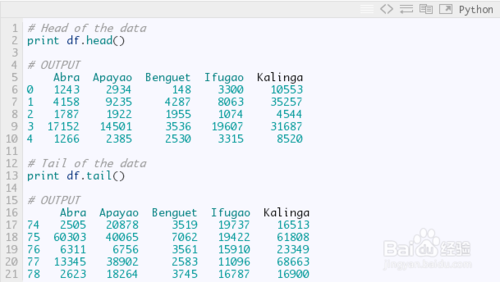对R语言程序员来说,上述操作等价于通过print(head(df))来打印数据的前6行,以及通过print(tail(df))来打印数据的后6行。当然Python中,默认打印是5行,而R则是6行。因此R的代码head(df, n = 10),在Python中就是df.head(n = 10),打印数据尾部也是同样道理