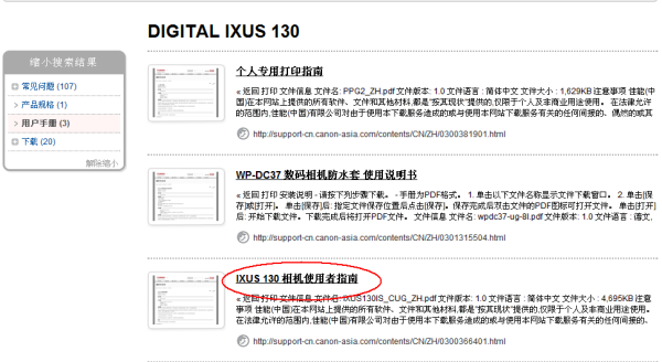 4).进入Digital IXUS130下载页面,选择【IXUS130相机使用着指南】