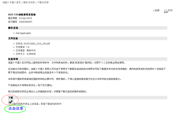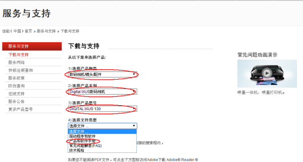 在【选择产品种类】里选择数码相机/镜头/配件→【选择产品系列】里选择Digital IXUS数码相机→【选择产品型号】里选择Digital IXUS130→【选择文件类型】里选择产品和软件手册