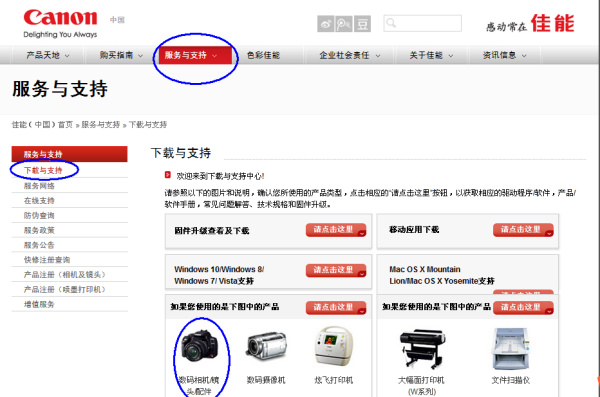 2).选择【下载与支持】→【下载与支持】→【数码相机/镜头/配件】。