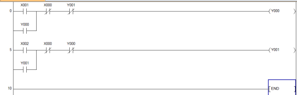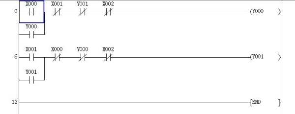 下面是一个控制电机正反转的程序:X0,X1分别是正反转启动按钮,X2是停止按钮,Y0,Y1分别是正反转接触器,配合外围倒相电路就可以了。