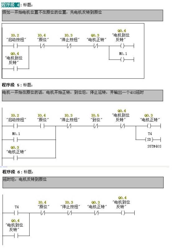 我的思路是分两步:如果一开始电机不停在原位的位置上,需先电机反转到原位后,在开始你描述的工作状态,另外就是电机一开始就在原位的位置上。现将我的编程附上,也是才学。编程是梯形图截图下来的。编程软件是西门子S7-300,输入输出点都加注释了希望你看懂。纯手打的,希望能帮助到你