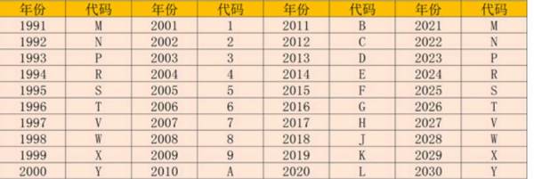 车架号第十位表示该车辆的生产年份(生产年份由1、2、3、4、5、6、7、8、9、A、B、C、D、E、F、G、H、J、K、L、M、N、P、R、S、T、V、W、X、Y 30个字符,30年一个轮回周期),同时车架号并没有用于表示车辆生产月份的代码,具体生产月份需在中央立柱的车辆铭牌上查看。通过车架号的话只能查看到车辆的年份,月份需要自己在车辆的铭牌上查看了。车架号是无法体现出月份的。