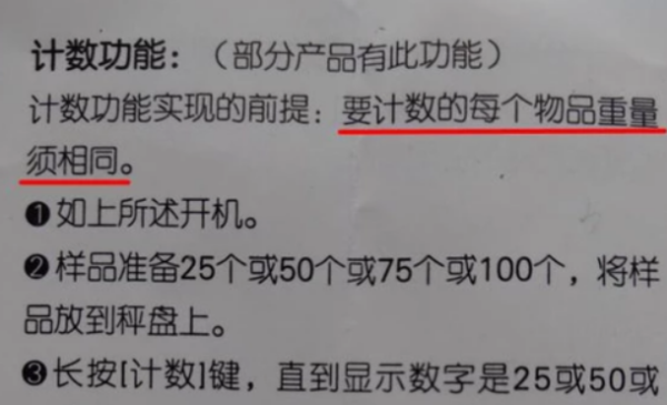 1、使用计数功能的前提是每个物品的重量要相同,最好是一模一样的同类物品,单个物品的重量要视电子秤的测量精度定,不能太轻,物品的数量也尽量多一些。