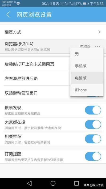 3:打开网页浏览设置,找到浏览器标识,点开。选择电脑版。