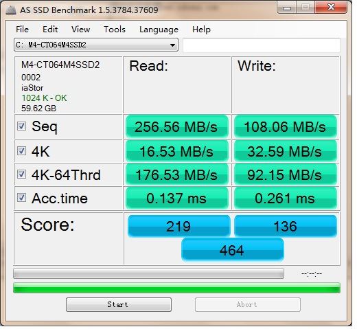 3、再用AS_SSD_Benchmark测试一下得分,还可以通过它查看是否4K对齐,测试的得分只做参考,因为其分数与CPU类型、频率、是否关闭节能等因素相关,如果分数与宣传的差别不是很大就算正常。