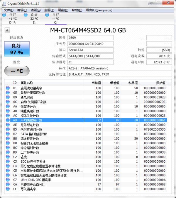 1、首先下载一个CrystalDiskInfo软件,查看一下硬盘使用情况,主要看通电次数、写入量,擦出计数等判断是否是新盘。