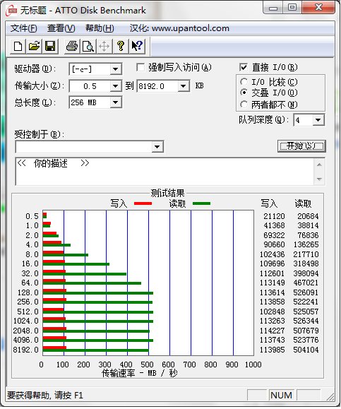 4、还可以用ATTO Disk Benchmark测试下写入和读取速度,测试的最大速度应该和SSD标称的速度相当才算正常。