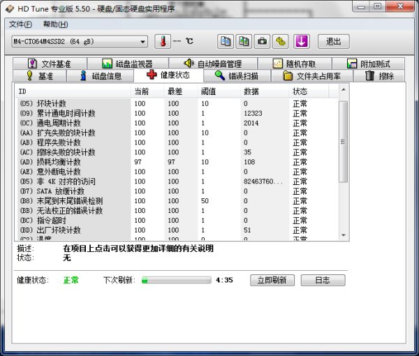 2、可以下载个HDTUNE测试一下,虽然它是测试机械硬盘的,也可以测测SSD硬盘,可以测测基准读取和写入,随机存取、健康状况等。