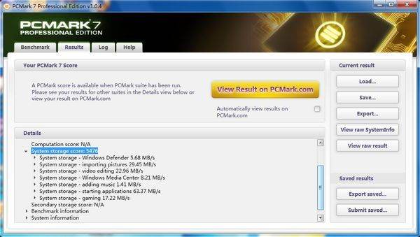 5、另外可以用PCMARK 7和PCMARK 8测试硬盘性能,这个是比较专业的,目前主流SSD硬盘得分基本都在5000左右。