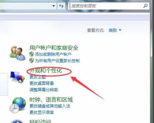 1、在控制面板首页单击打开“外观和个性化”,进入设置菜单。
