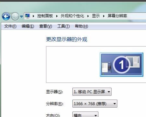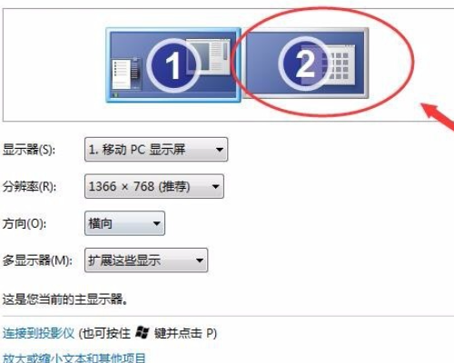 6、将光标移到第二个屏幕上面直接单击鼠标左键进行选择,就可以对另一个显示器的参数进行设置了,可以设置显示器模式、分辨率、方向、和多显示器几个选项进行设置,下面还有一个功能就是将这个显示器设为主显示器。