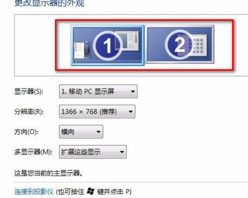 5、现在可以明显的看到更改显示器的外观就有两个屏幕了,可以对这两个屏幕的参数进行设置