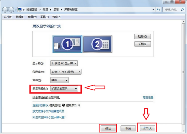 (3)进入后,在多显示器选项里有扩展、复制等选项。扩展表示两个屏幕只有桌面背景一样;复制表示两个显示器的画面完全相同。根据自己的需要选择好后点击确定进行保存,最后点击应用即可;