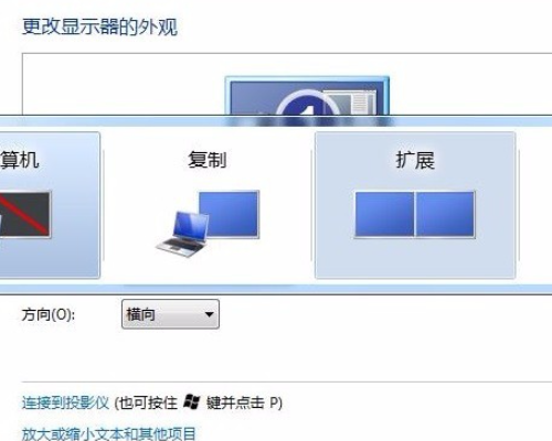 4、在弹出的对话框,有仅计算机、复制、扩展、仅投影仪四个选项,单击选择第三项“扩展”这个图标也是两个屏幕和功能就对应上了。