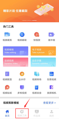 1、首先打开“清爽视频编辑器”,然后点击首页下方项目栏中的“视频工具”,进入视频工具页面。