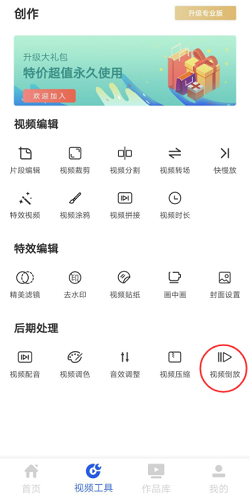 2、在视频工具页面中,点击后期处理模块中的“视频倒放”功能,进入视频导入页面。
