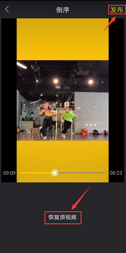 5、倒放制作完成后,点击“恢复原视频”即可恢复正常播放。点击页面右上角的“发布”将制作完成的视频分享给好友。