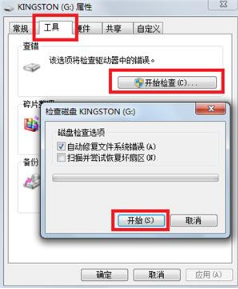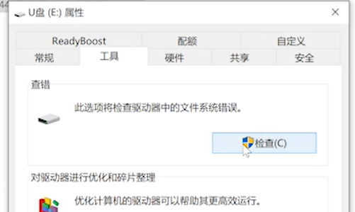 4、除此之外,我们还可以借助Windows提供的“磁盘修复”工具对U盘进行磁盘检测及修复操作。如图所示,在“可移动磁盘属性”界面中,点击“检测”按钮进行修复。