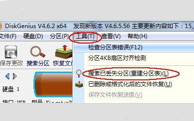 4、选择“工具”,搜索已丢失分区(重建分区)。