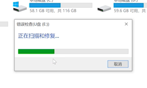 3、接下来CHKDSK命令将自动对U盘中的文件进行修复操作,同时对错误的文件进行修复操作。待整个修复操作完成后,就可以打开U盘读取文件了。