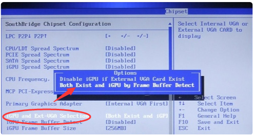 3、找到“iGPU and Ext-VGA Seletion”选项,选择“Both Exit and Frame Buffer Detect”,启用共享显存。