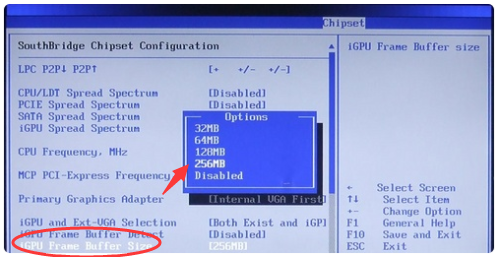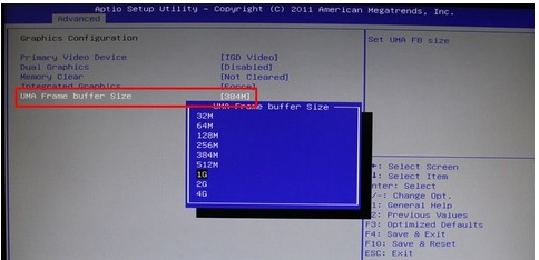 开机按DEL-进入COMS-进入选项Advanced Bios Features-Frane Buffer Size -里面会有32M、64M、128M、256M。