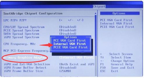 2、在详细设定界面中找到“Primary Graphics Adapter”选项(初级显示适配器),点击Enter进入设定项目,将它设定为“Internal VGA First”。