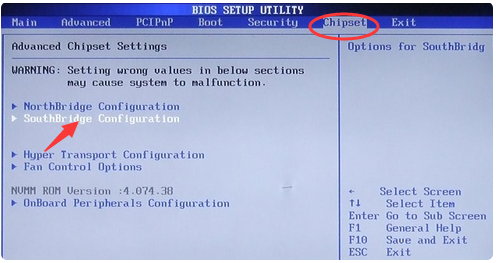 在下面的界面中找到南桥设定选项(South Bridge Configyration),点击Enter进入详细设定界面。