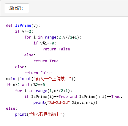 按照题目要求编写的哥德巴赫猜想的Python程序如下