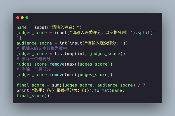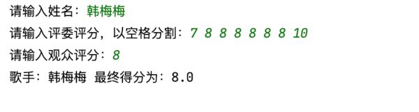print("歌手:{0} 最终得分为:{1}".format(name, final_score))
