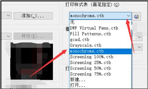 3、然后进入新的界面,咋还都熬打印样式表的位置,点击旁边的按钮进行选选择,点击monochrome.ctb选项即可。