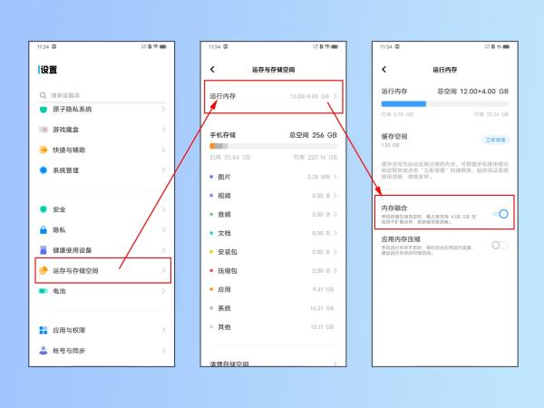 4、进入设置--运存与存储空间--运行内存--开启内存融合,将RAM和ROM融合扩展;若有应用内存压缩选项,也可开启;